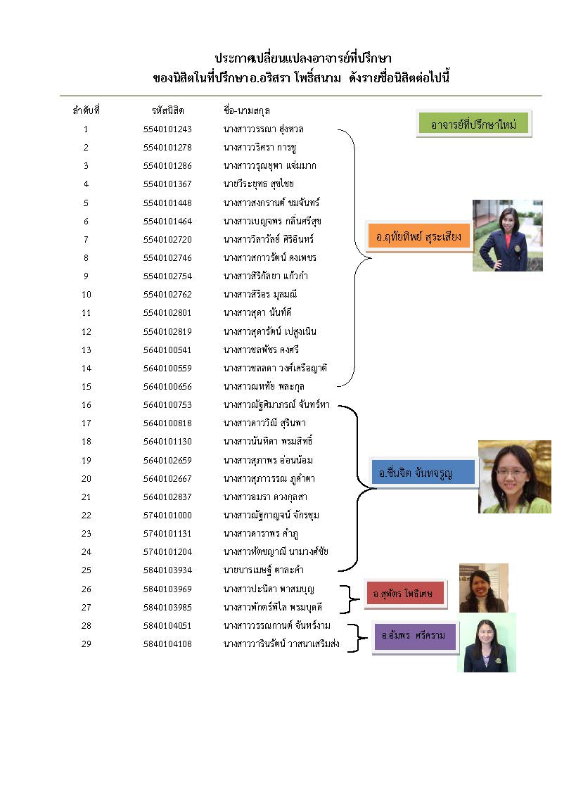 ประกาศเปลี่ยนแปลงอาจารย์ที่ปรึกษา นิสิตในที่ปรึกษา อ.อริสรา โพธิ์สนาม