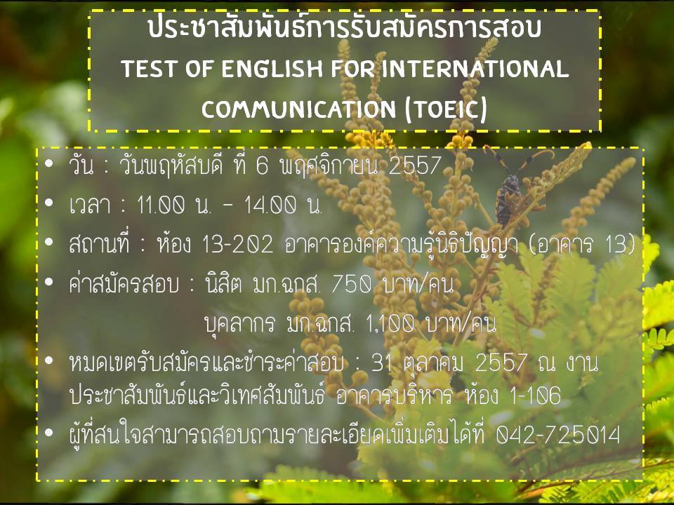 ด้วยงานประชาสัมพันธ์และวิเทศสัมพันธ์ มก.ฉกส. ร่วมกับศูนย์สอบ TOEIC Services จะทำการสอบ TOEIC (The Test of English for International Communication) เพื่อให้นิสิตที่กำลังจะจบการศึกษาได้วัดความรู้ความสามารถทางภาษาอังกฤษ ในการประกอบเพื่อเตรียมตัวทำงาน ตลอดจนเป็นข้อมูลใช้ในการสอบเรียนต่อทั้งในและต่างประเทศได้